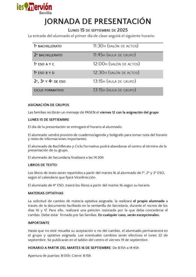 © Instituto de Educación Secundaria Nervión. Profesor Buenaventura Pinillos, 2. 41005 Sevilla Teléfono: 955623788 Email: 41010769.edu@juntadeandalucia.es Horario de clases: 8:15- 14:45h Tardes: Lunes y Miércoles de 16:00 a 18:00h